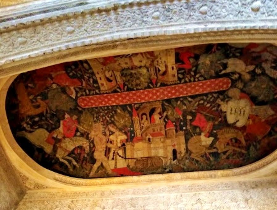 Κάνοντας την βόλτα σας μέσα στα παλάτια, μην ξεχάσετε να ρίξετε μια ματιά ψηλά, στις οροφές των δωματίων. Πέρα από τις περίτεχνες οροφές , θα δείτε σε μερικά σημεία τοιχογραφίες με έντονα κόκκινα, πράσινα ή χρυσά χρώματα (χριστιανικά χρώματα). Αυτό διότι οι Καθολικοί Βασιλείς, μόλις κατέβαλαν την Γρανάδα και την Αλάμπρα το 1492, θέλησαν να επιβάλουν το στοιχείο τους και στο μνημείο.